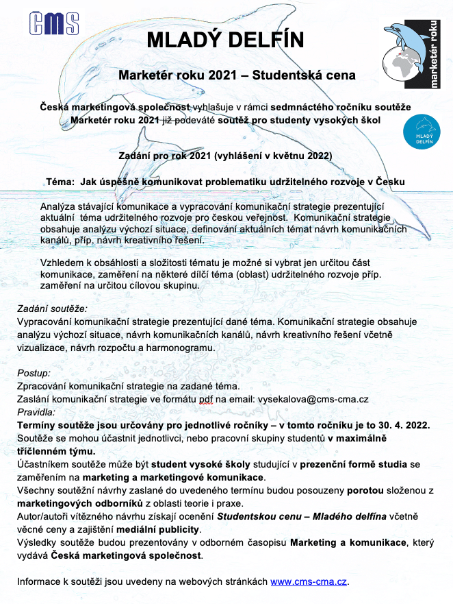 Autor či autoři vítězného projektu získají v rámci slavnostního galavečera k předávání cen Marketér roku oceněni Studentskou cenu – Mladého delfína včetně věcné ceny a zajištění mediální publicity.