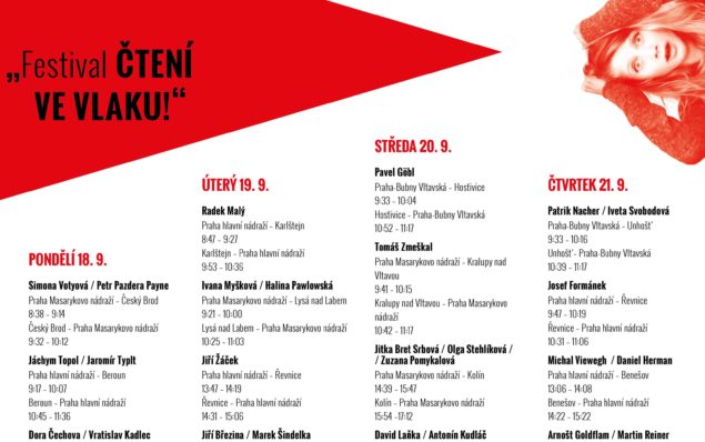 Letošní Čtení ve vlaku potrvá 4 dny. Od pondělí 18. září do čtvrtka 21. září 2017. Ze svých knih budou číst stejně jako v minulých ročnících Michal Viewegh, Martin Reiner, Vratislav Kadlec, Ivana Myšková, Halina Pawlowská, Olga Stehlíková, Jitka Bret Srbová, Dora Čechova, Pavel Göbl, Jiří Březina, Josef Formánek, Jáchym Topol, Jaromír Typlt, Marek Šindelka, Jiří Žáček, ministr kultury Daniel Herman, David Laňka, Arnošt Goldflam, Petr Pazdera Payne, Antonín Kudláč, Tomáš Zmeškal a Radek Malý a nově Patrik Nacher, Simona Votyová, Iveta Svobodová.