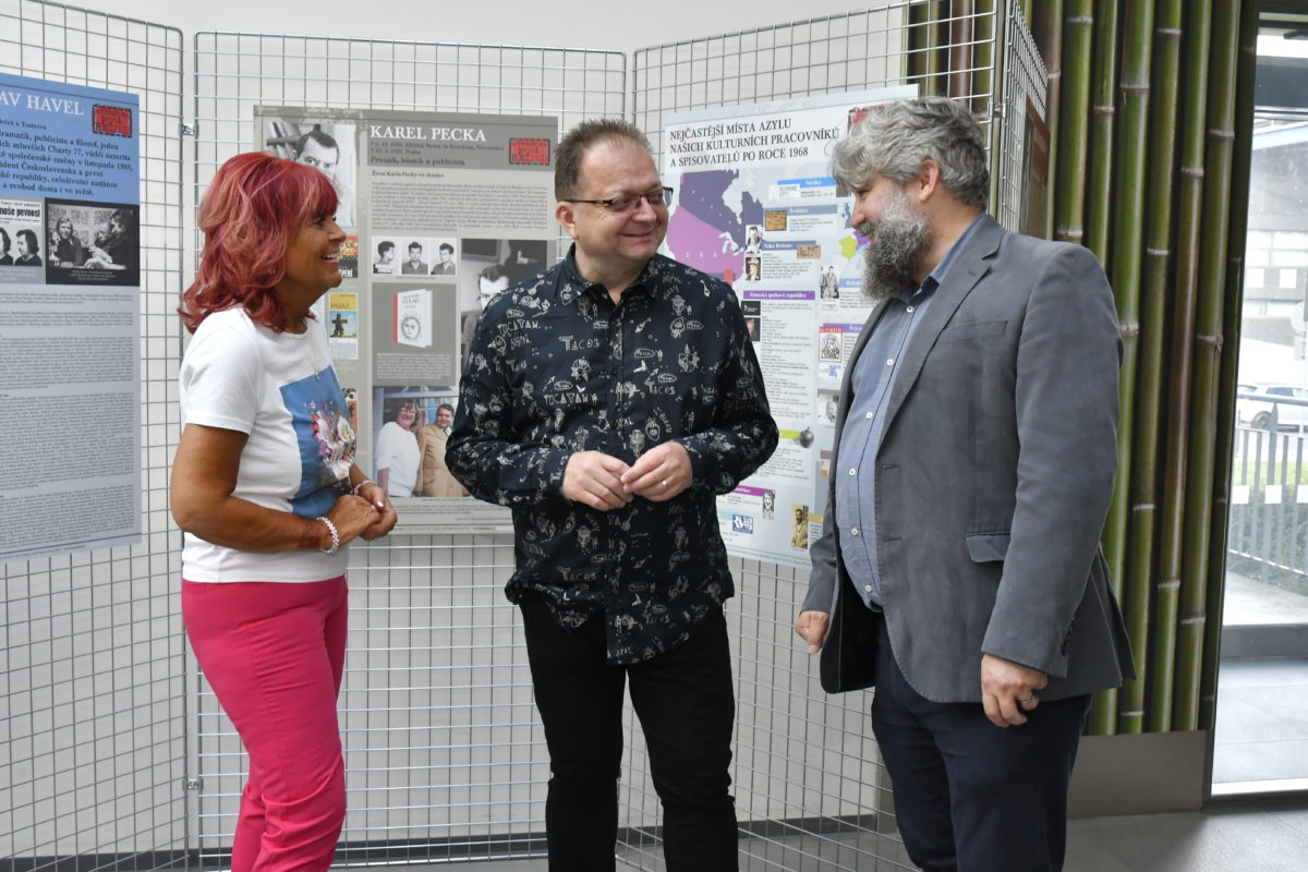 Autor výstavy, ředitel Literární akademie Václav Krištof, starostka MČ Praha 4 Irena Michalcová a místostarosta Michal Hroza