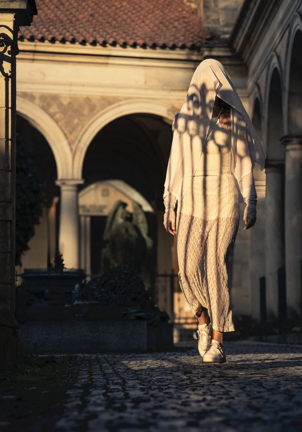 Popis díla: A veiled figure walks through an old courtyard, caught between shadow and light. The hidden face and translucent fabric evoke mystery, blurring the line between presence and absence.