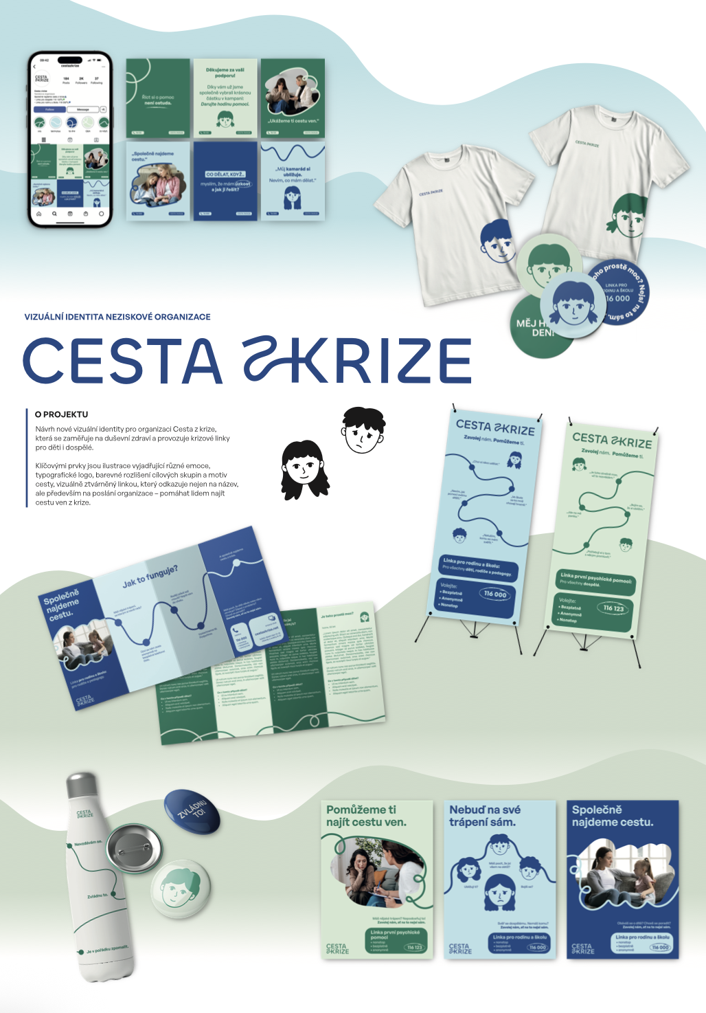 Popis díla: Realizace redesignu značky a vizuálního stylu pro neziskovou organizaci Cesta z krize zabývající se poradenstvím a pomocí lidem v krizi. Autorka navrhla novou značku, kompletní vizuální styl a komunikační kampaň.